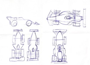 Ξεκινήσαμε με τον σχεδιασμό του αυτοκινήτου σε χαρτί και αργότερα, αφού κάναμε τους αναγκαίους υπολογισμούς για τις διαστάσεις του, αρχίσαμε να το μεταφέρουμε και στον υπολογιστή.